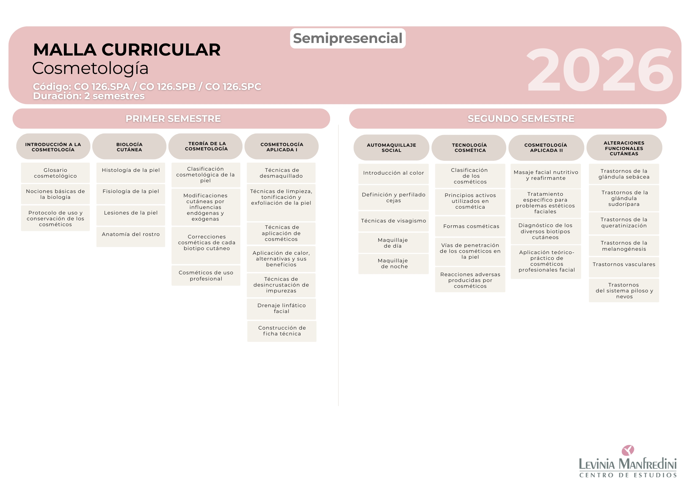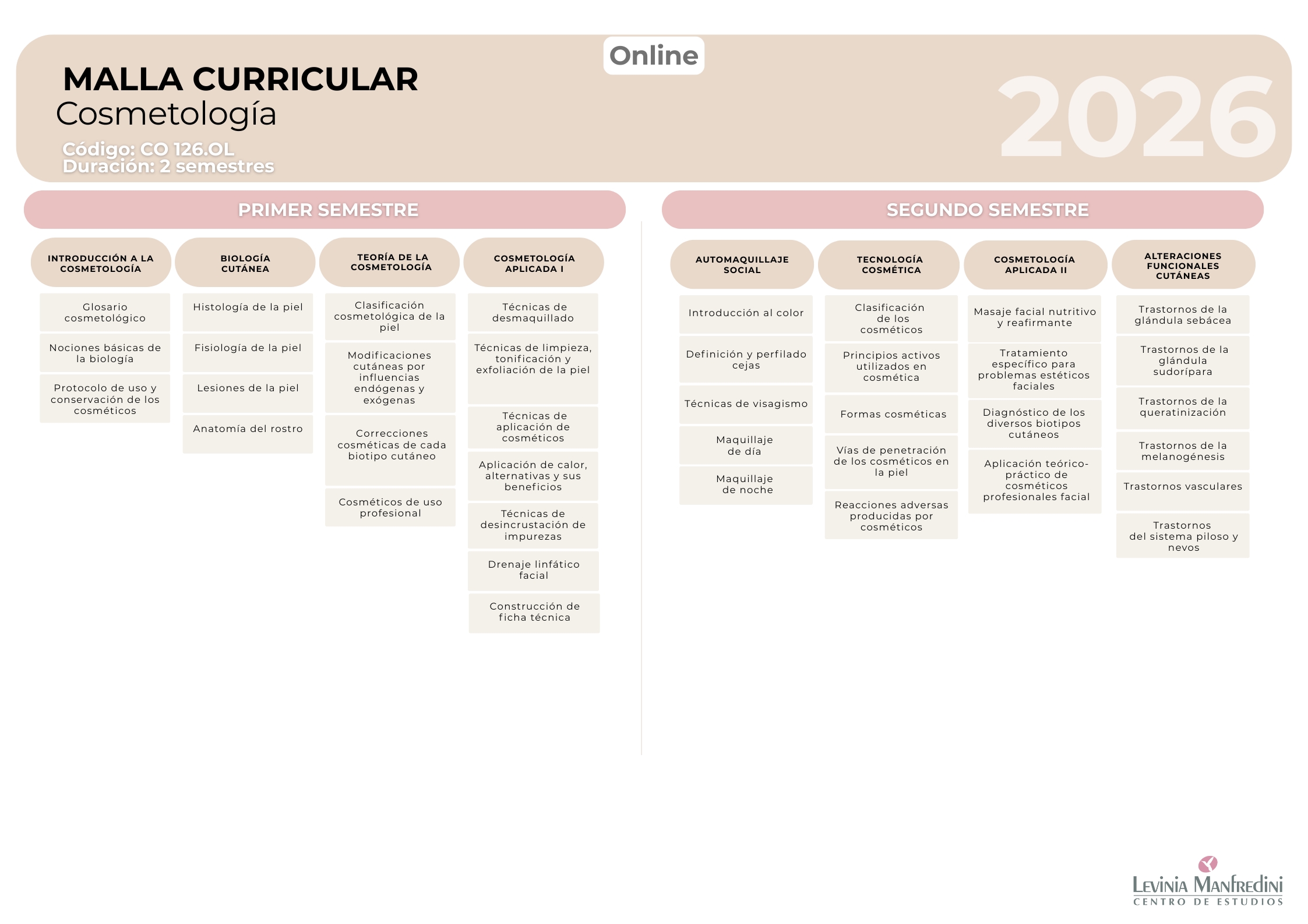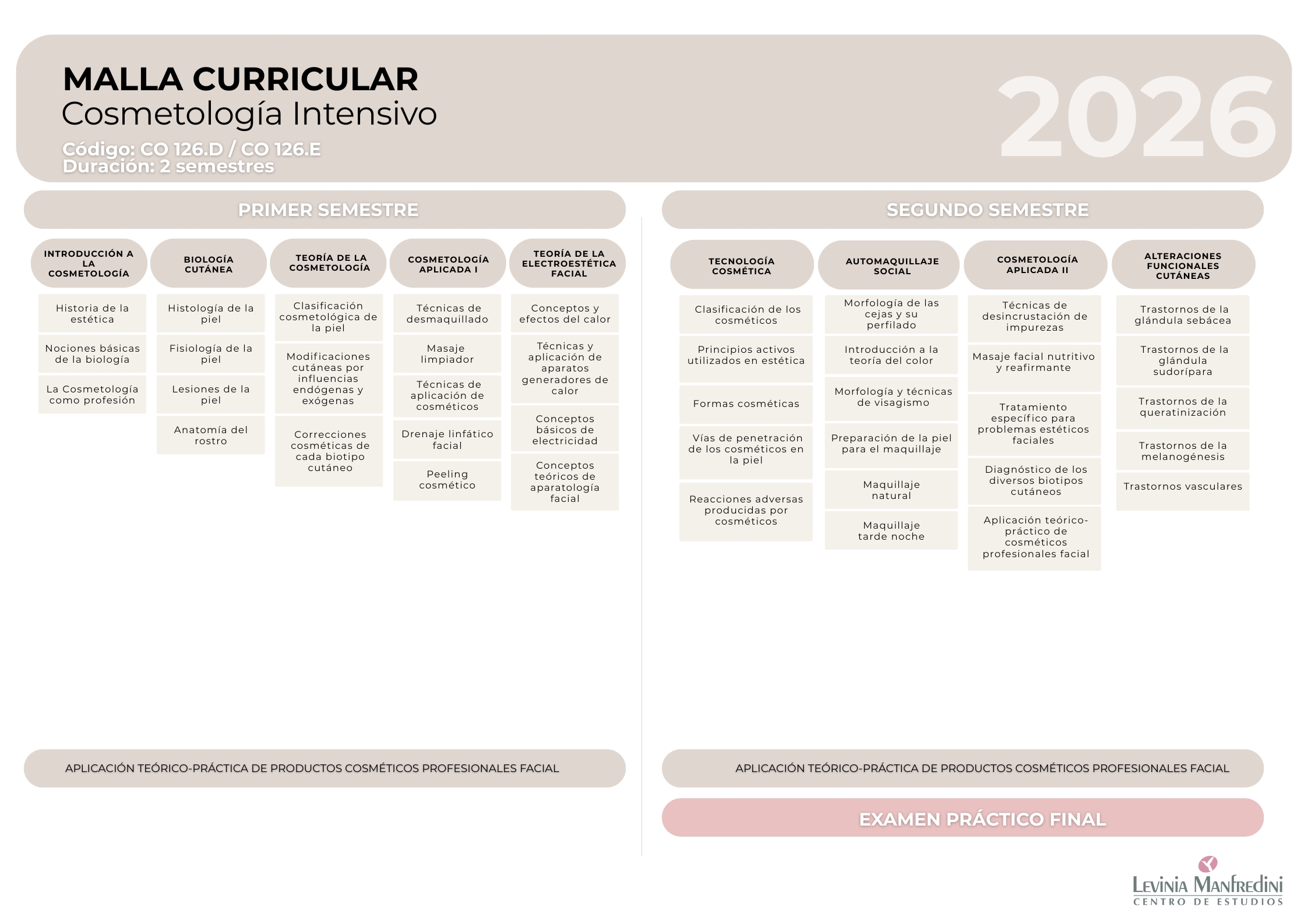 - Todos los productos cosméticos para las clases prácticas serán aportados por el Centro de Estudios Levinia Manfredini. El maquillaje, materiales e insumos de uso personal para las clases prácticas deben ser aportados por los estudiantes,