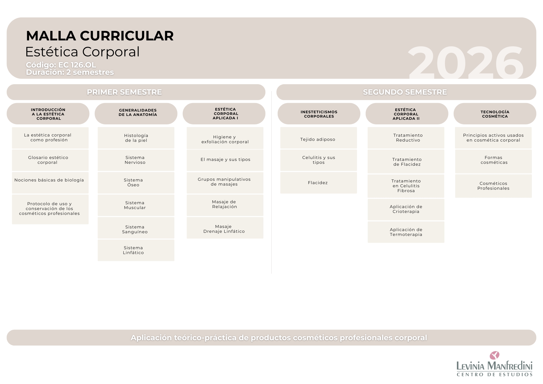 - Todos los productos cosméticos para las clases prácticas serán aportados por el Centro de Estudios Levinia Manfredini. El maquillaje, materiales e insumos de uso personal para las clases prácticas deben ser aportados por los estudiantes,