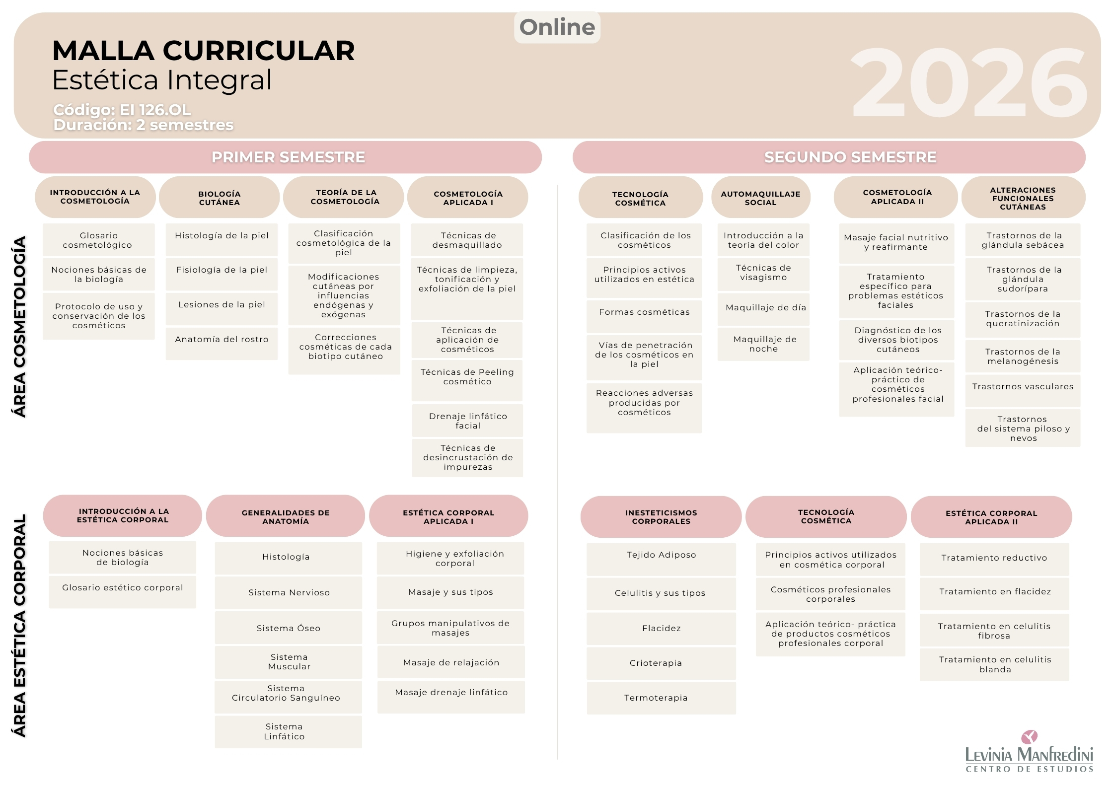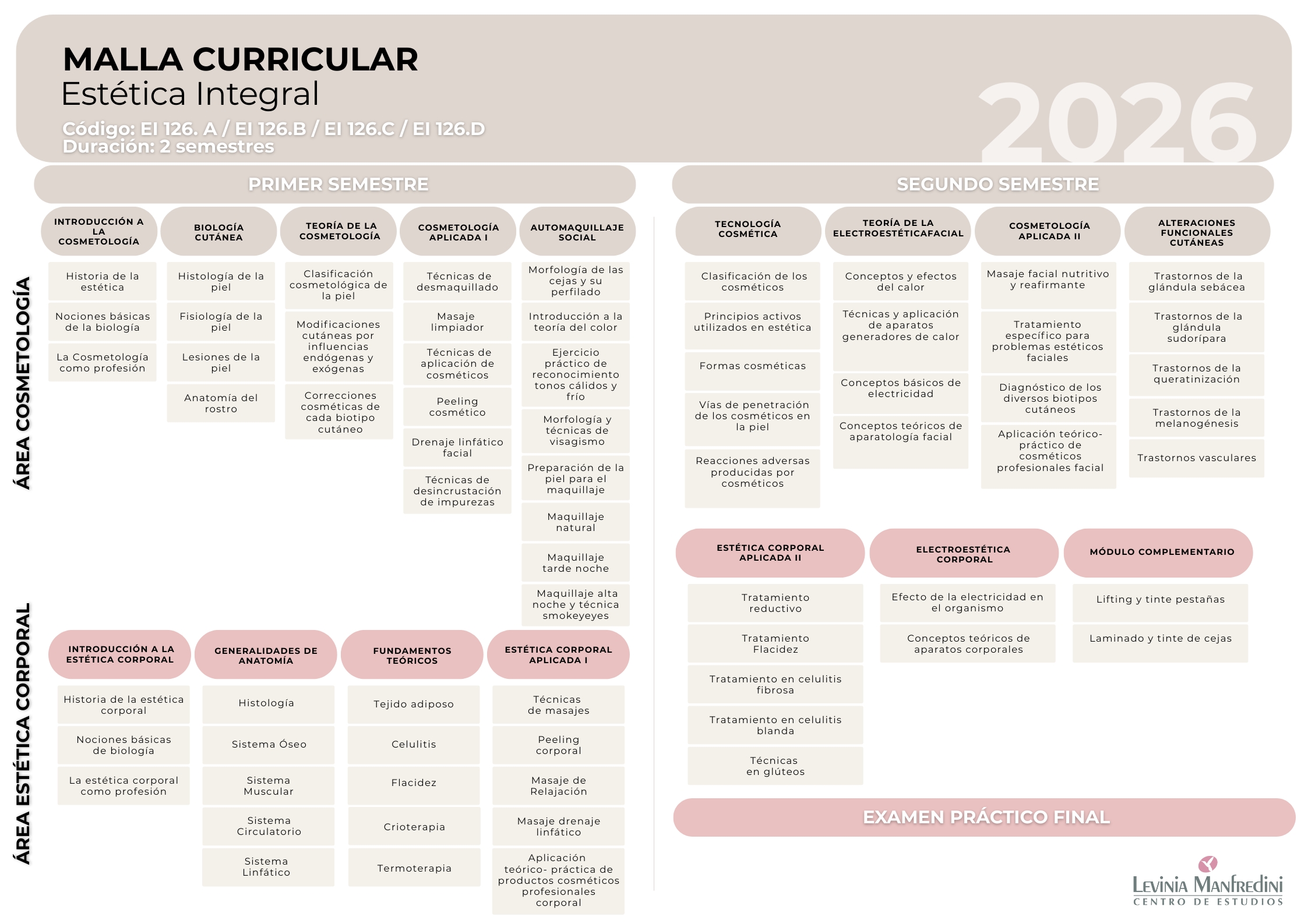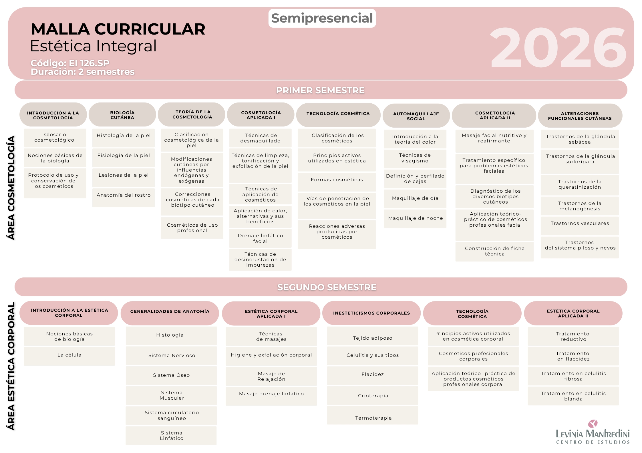 El Curso de Estética Integral reúne en un solo programa los contenidos de Cosmetología y Estética Corporal, entregando una formación amplia y profunda en el cuidado estético tanto del rostro como del cuerpo.